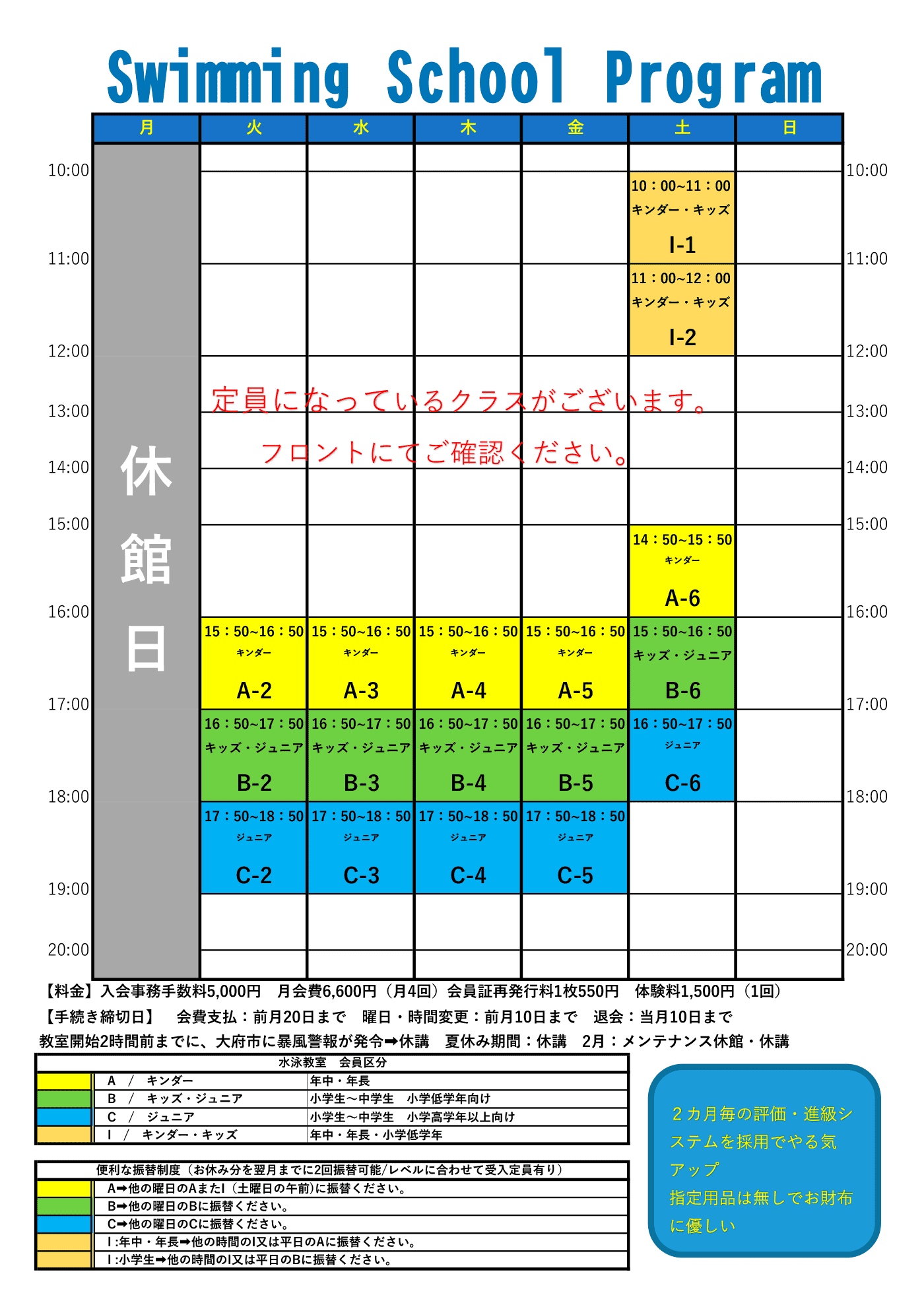 | ジュニア | 火~金 | 17:50~18:50 | 小学生 段階的指導法を用いた泳力別のグループ指導 水泳の技術習得から4泳法の習得を目的としたクラス |